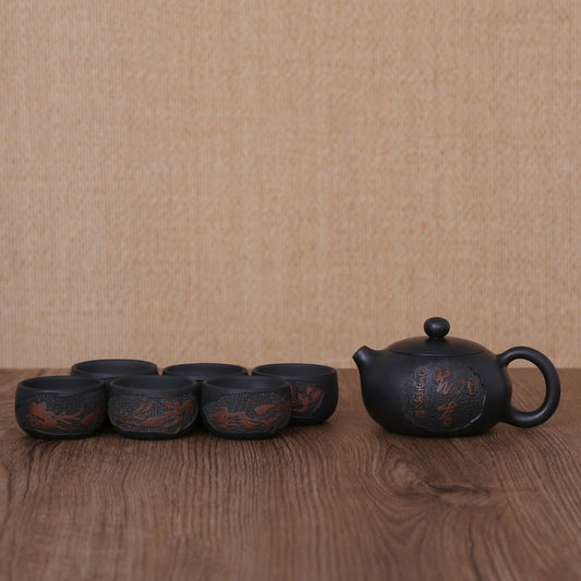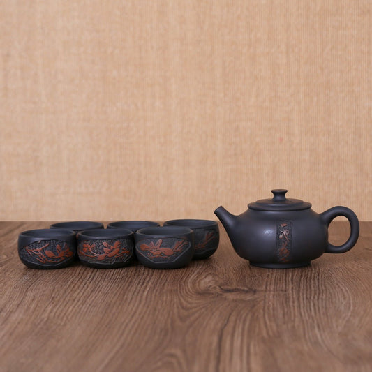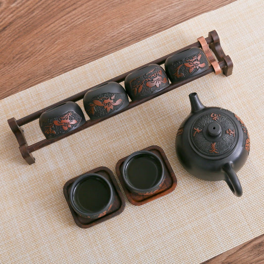 Handcraft Copper Cash And Flower Carving Jian Shui Purple Pottery Gift Tea Set