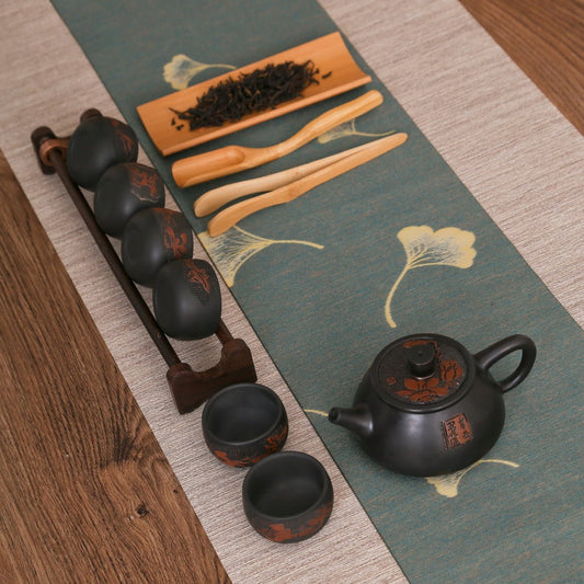 Handcraft Carving Flower Leaf Jian Shui Purple Pottery Gift Tea Set